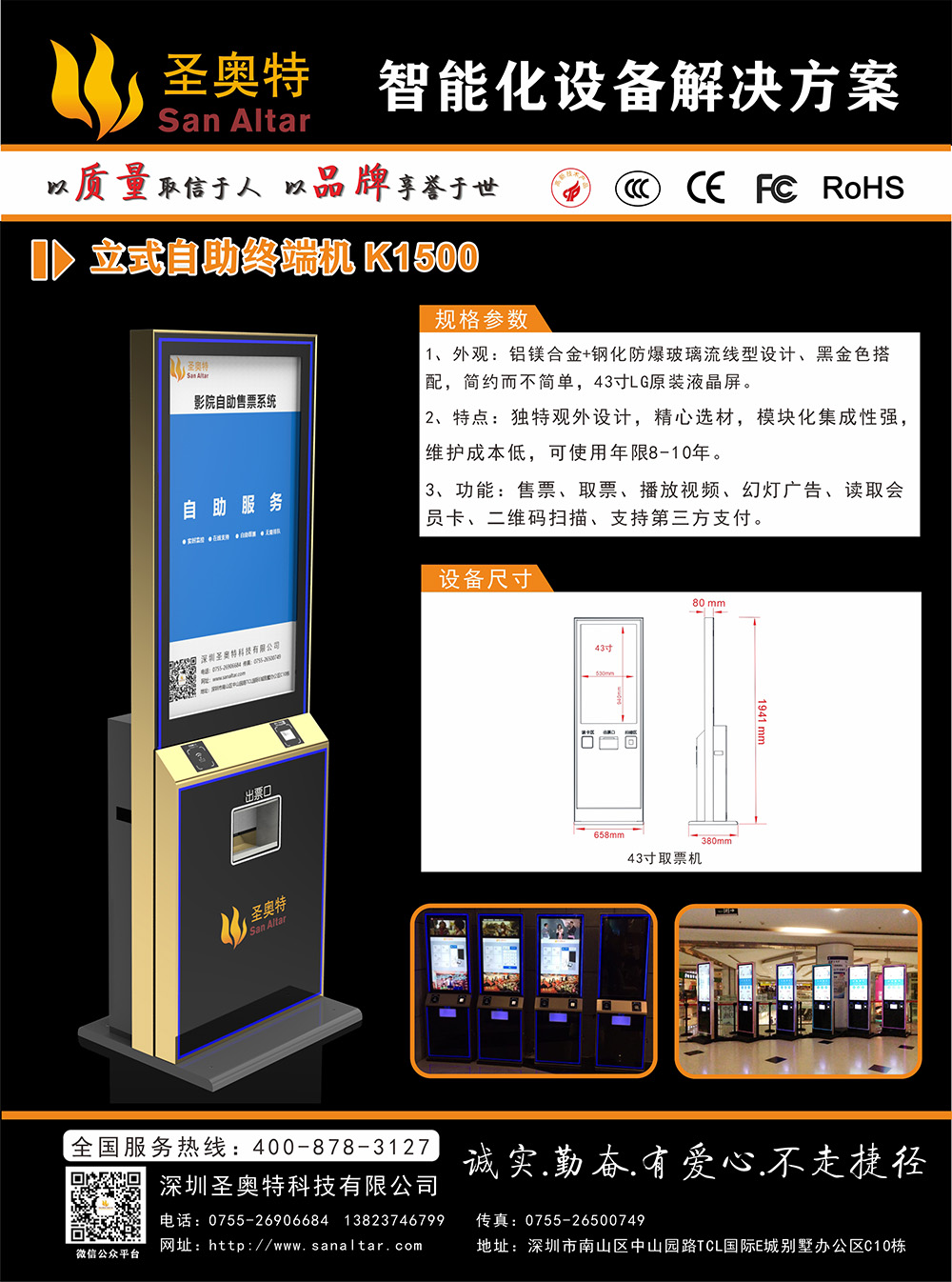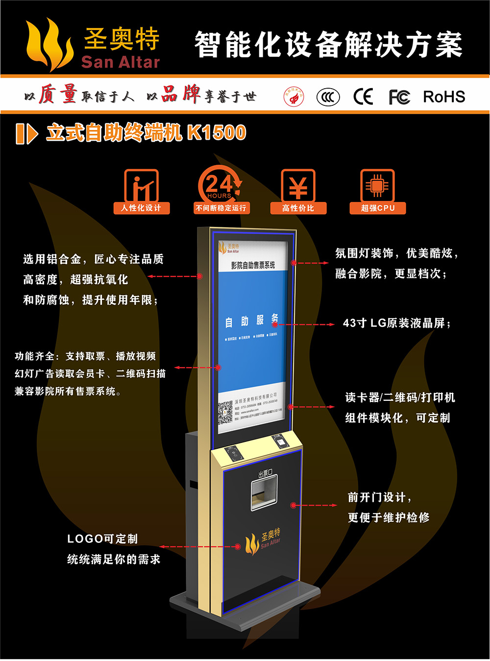 圣奧特K1500 立式自助終端機 廣泛應用于:智慧影院 智慧景區 智慧場館 智慧醫院等