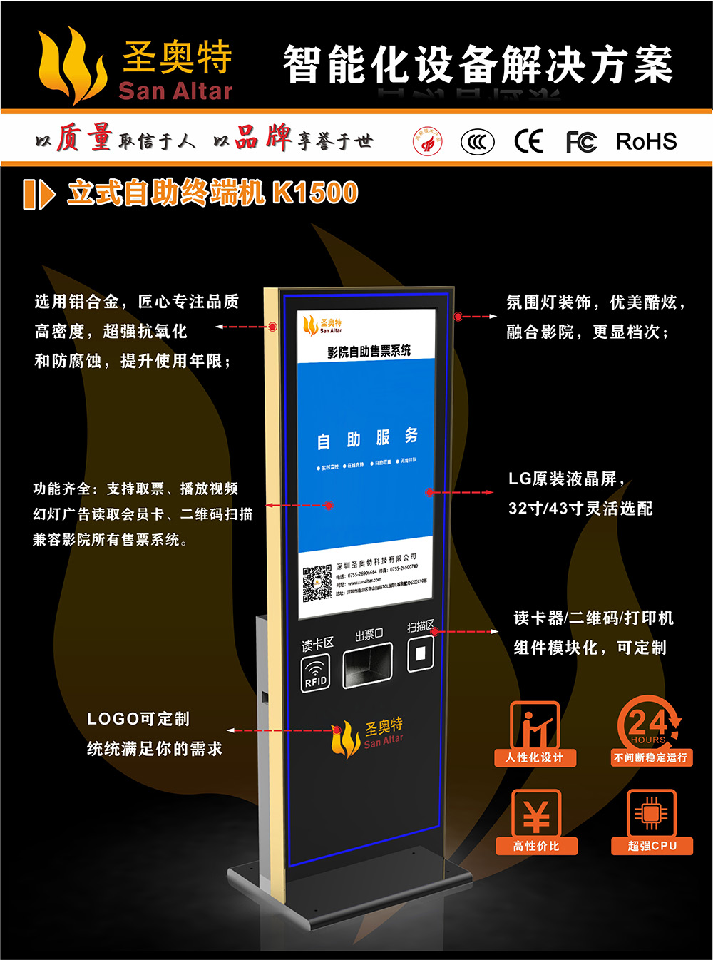 圣奧特K1500 立式自助終端機 廣泛應用于:智慧影院 智慧景區 智慧場館 智慧醫院等