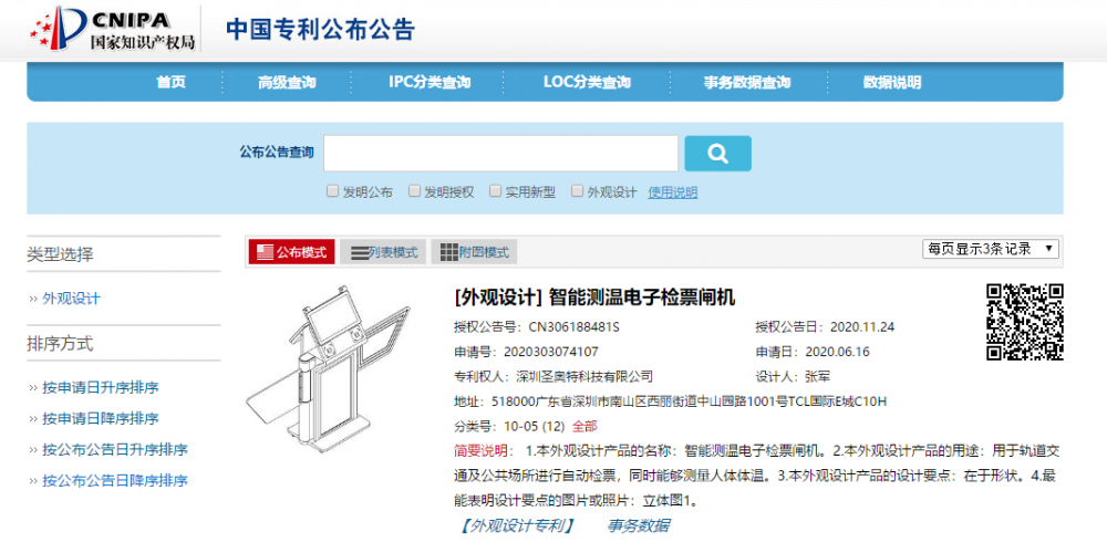 圣奧特電子檢票臺閘機于2020年11月24日成功申請外觀設計專利